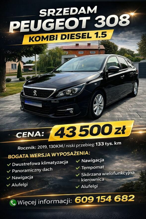 Na sprzedaż zadbany Peugeot 308 Kombi z niezawodnym i oszczędnym silnikiem Diesla 1.5 (130 KM).
